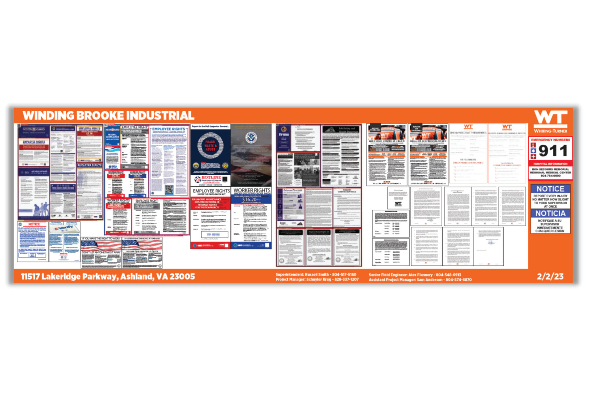 Order your mandatory jobsite compliance board with required state and federal government postings, safety guidelines, and Whiting-Turner notices. Signs will include your project name, address, and contact information. Please do not include your job number on the sign.