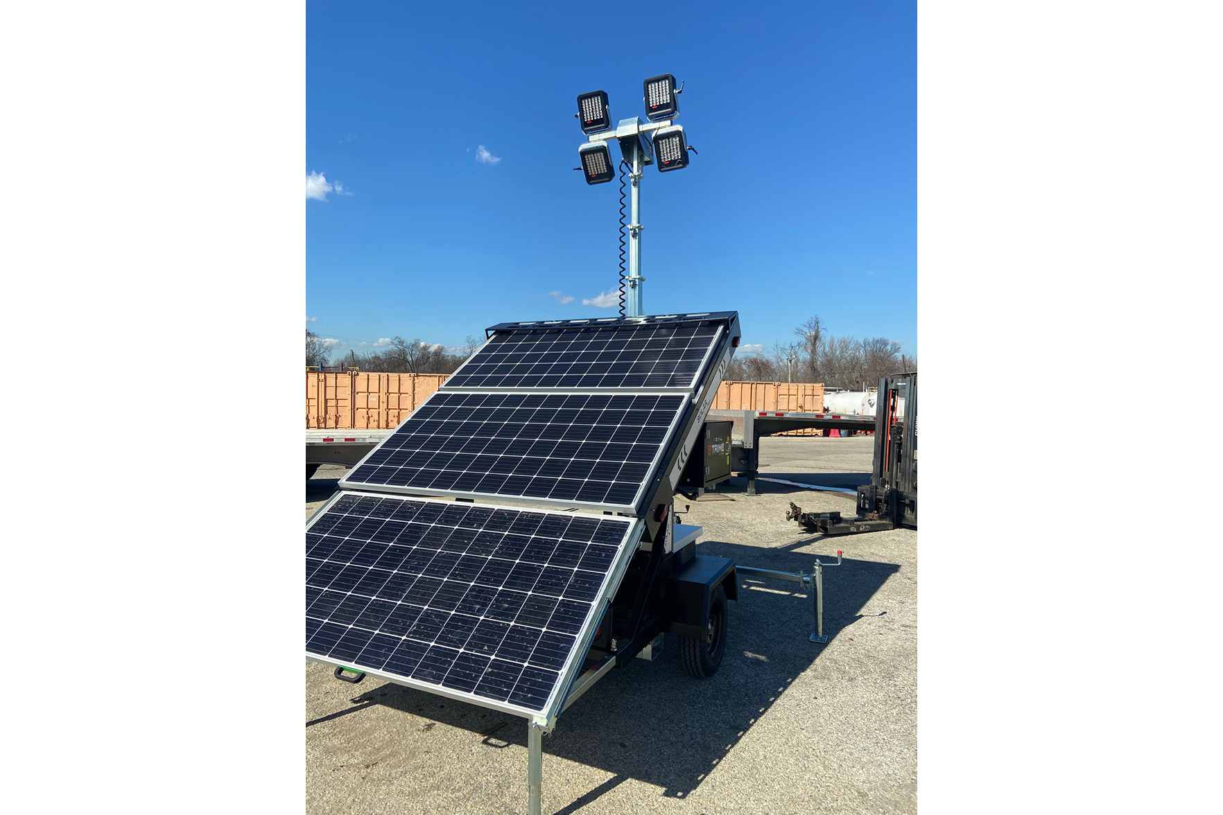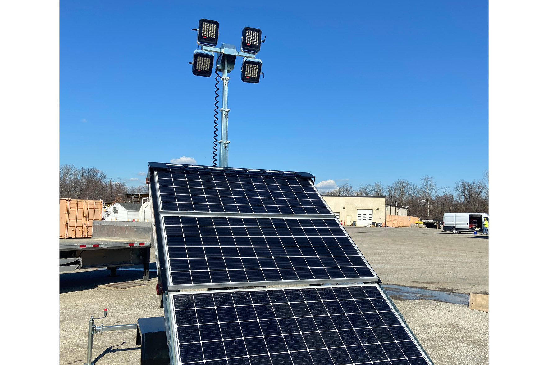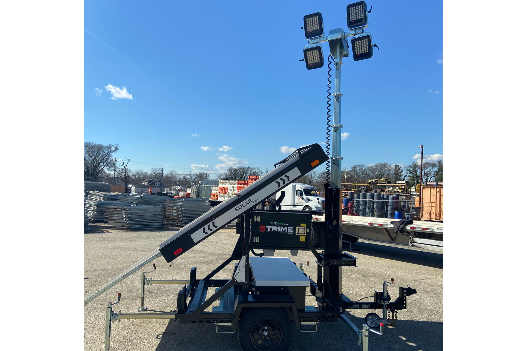 Energy-efficient LED outdoor light towers powered by renewable energy from the sun. Can be used where a diesel, gas, or electric generator powered light tower is needed. Provides 35,520 SF of light coverage.